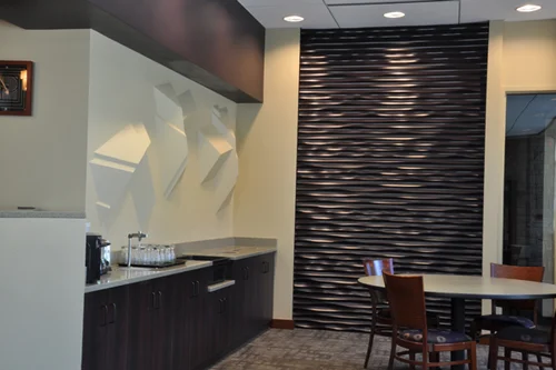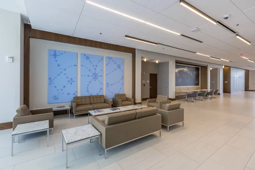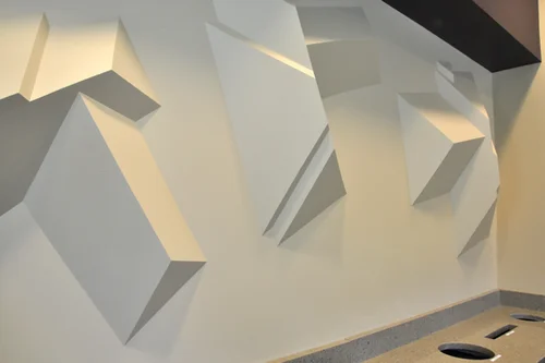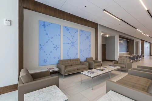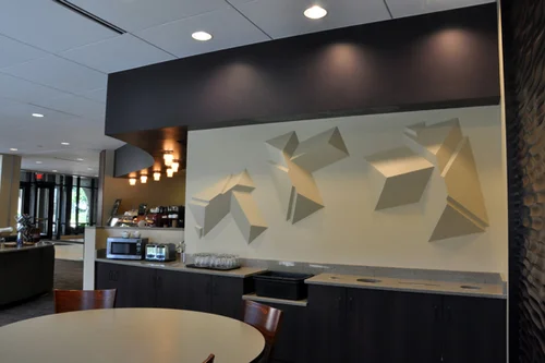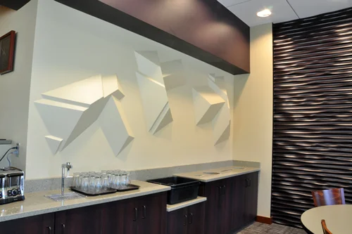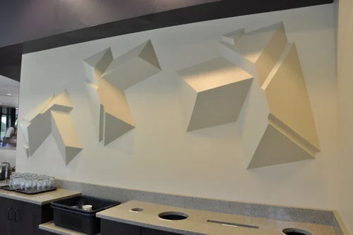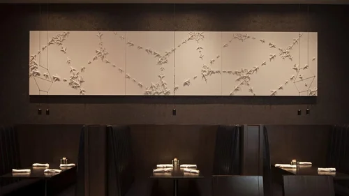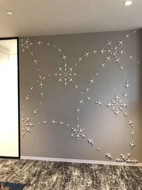 This wall installation in the waiting area of a travel agency is comprised of 144 porcelain airplanes. The composition is inspired by neurons and synapses in the human brain.